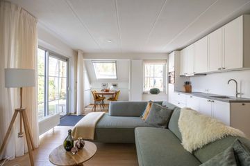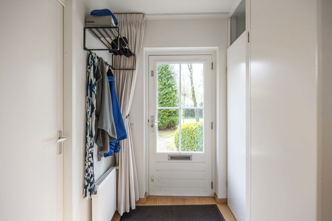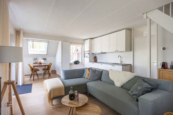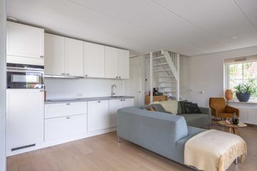 Hal/entree, toilet, badkamer met inloopdouche en wastafelmeubel, slaapkamer (8 m²). woonkamer (29 m²) voorzien van eiken parketvloer en houtkachel, open keuken met inbouwapparatuur (2020).