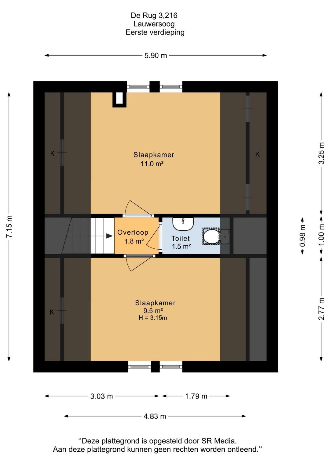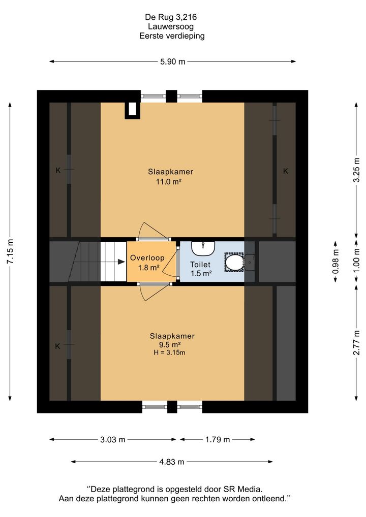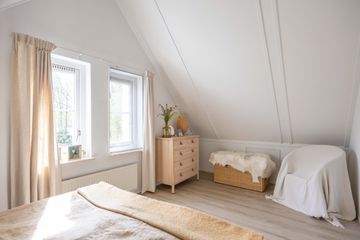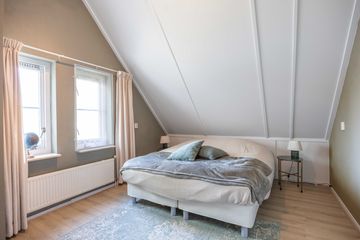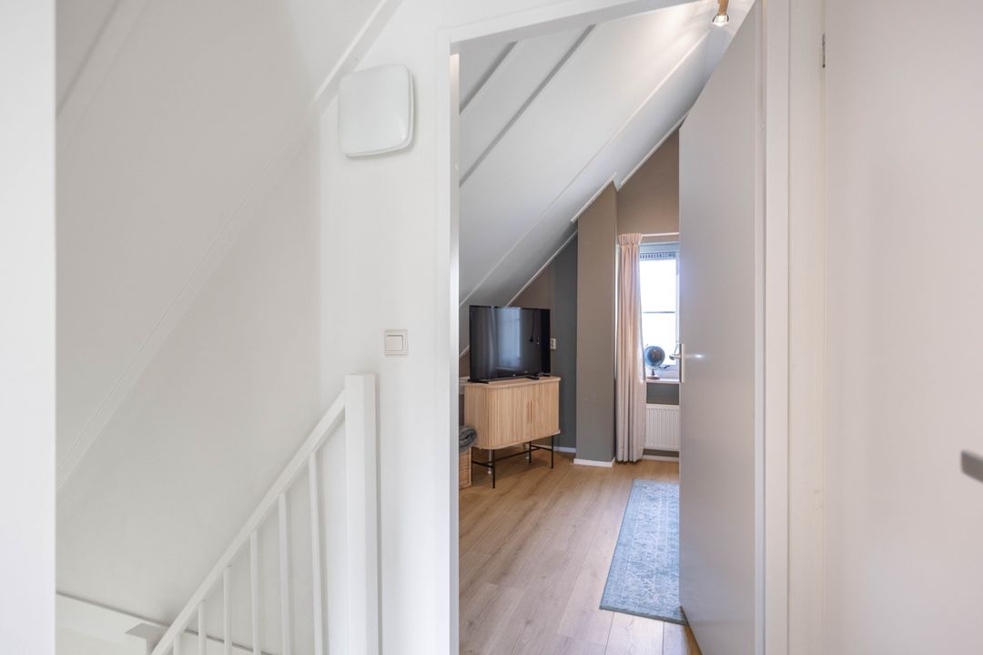 Overloop, 2e toilet, twee slaapkamers (10 en 11 m²) met bergruimte achter knieschotten.